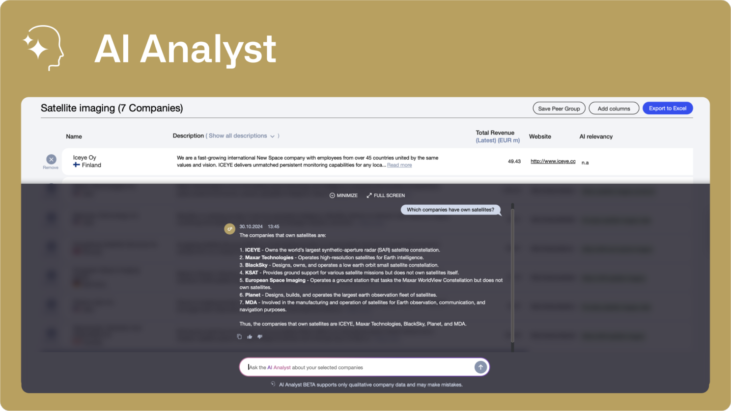 Our AI Analyst is engineered to support you with in-depth analysis for complex decisions. This powerful tool provides intelligent answers about your shortlisted companies, making it the best way to compare and evaluate products, services, and business models. Using a vast database and advanced reasoning capabilities, AI Analyst delivers actionable insights, helping you reduce hours of research into just minutes. Now, getting precise answers for your shortlist of companies is faster and more accurate than ever, ensuring you make well-informed choices.