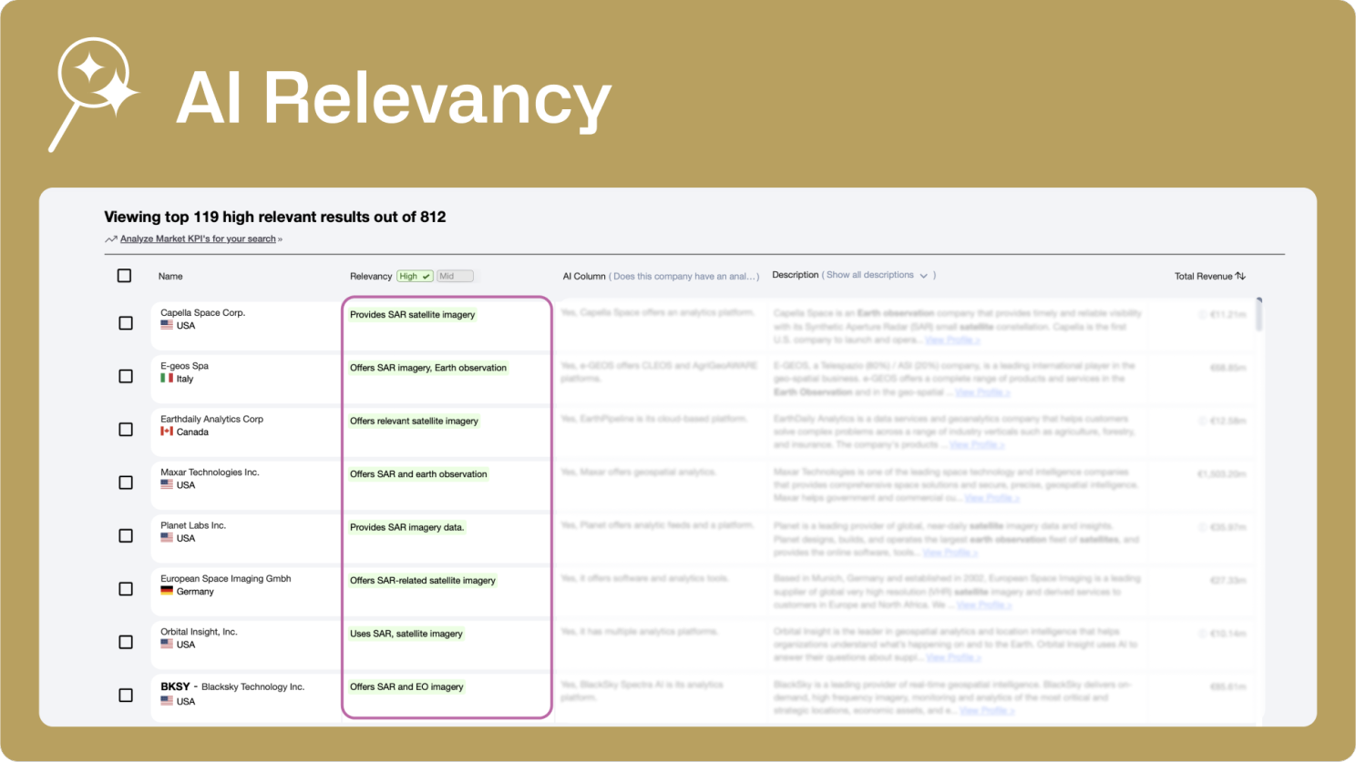 Never miss a relevant company again. Our new AI Relevancy feature focuses on refining your search, acting as your intelligent filter for fast results. This smart system quickly screens and identifies the most relevant companies based on your specific criteria, cutting out the noise and delivering only the insights that matter most to you. It’s been designed to make your workflow faster and significantly more focused, directly impacting your ability to identify promising targets efficiently.