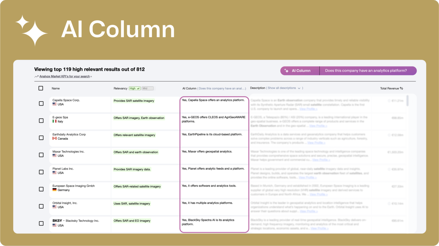 We created AI Columns to offer you a custom approach to insights and make screening multiple companies at once seamless. With AI Column, you can add a custom column to your search results and simply ask questions about your company list. This tool will then provide specific answers, from product details to market segments and business models. AI Columns tailors search results to bring you exactly what you need—no more, no less—ensuring your analysis is precise and perfectly aligned with your objectives.