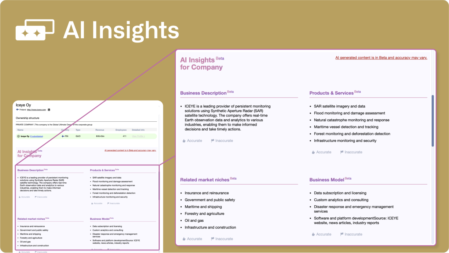 Want to become an expert fast? The AI Insights feature was developed to provide you with extensive information at your fingertips. Dive deep into company profiles, learning about products, services, business models, market segments, and even M&A activity across millions of companies. This feature transforms raw data into meaningful insights, making your research incredibly thorough yet remarkably simplified. Gain a comprehensive understanding in minutes, not hours.
